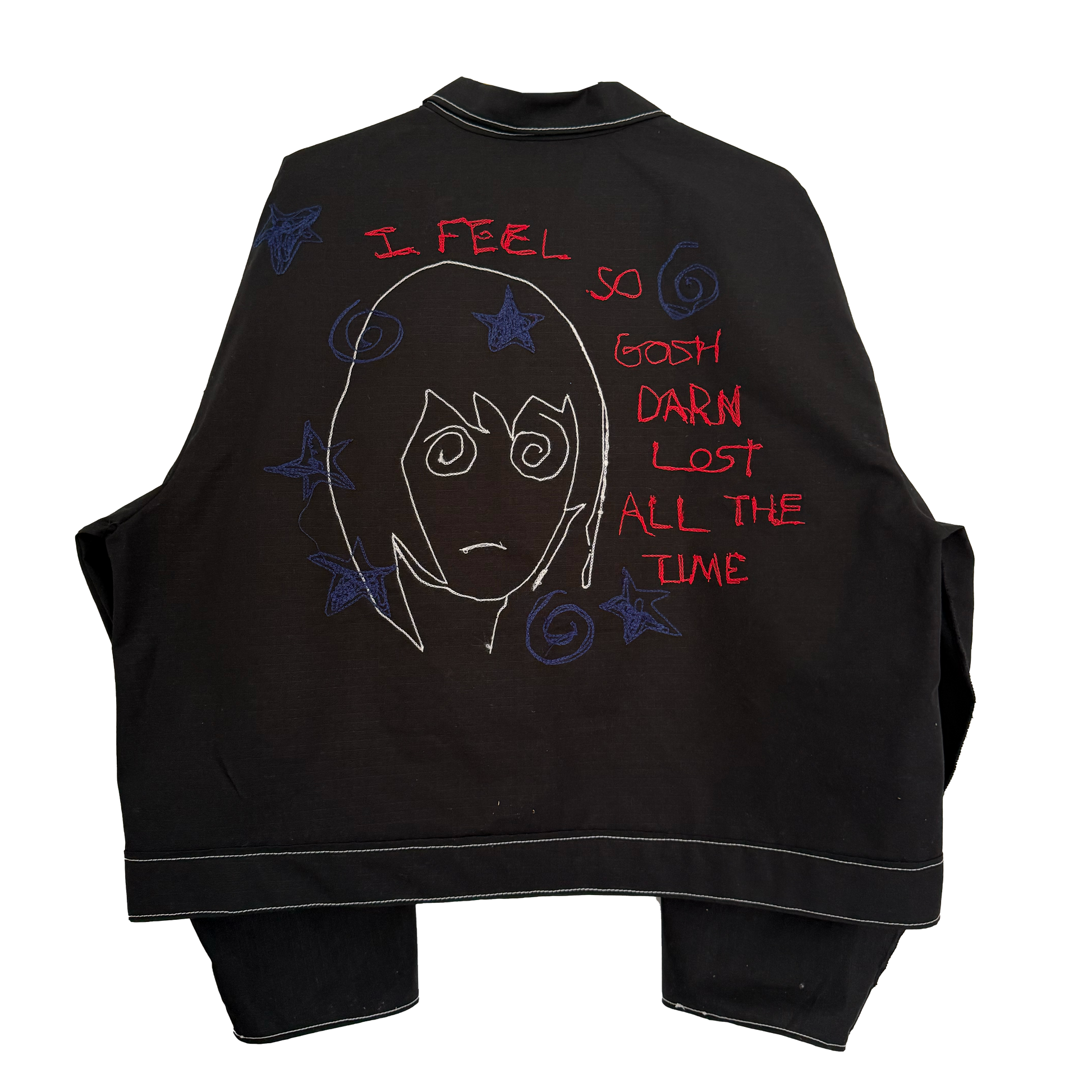 The jacket says I feel so lost all the time, im in a weird new stage of my life I don't have a routine i'm just trying to figure it out.