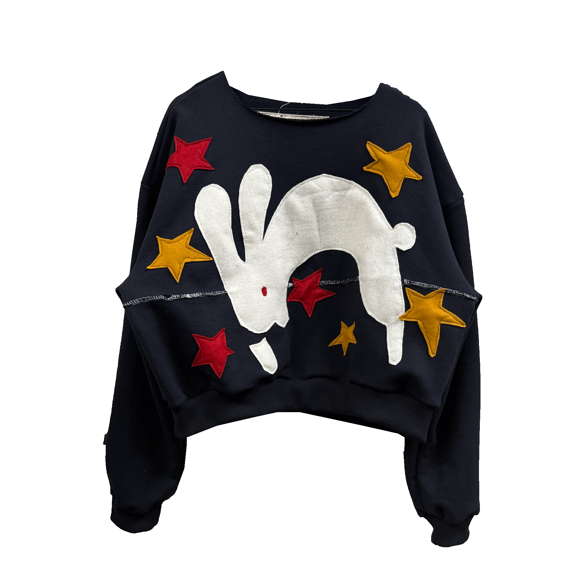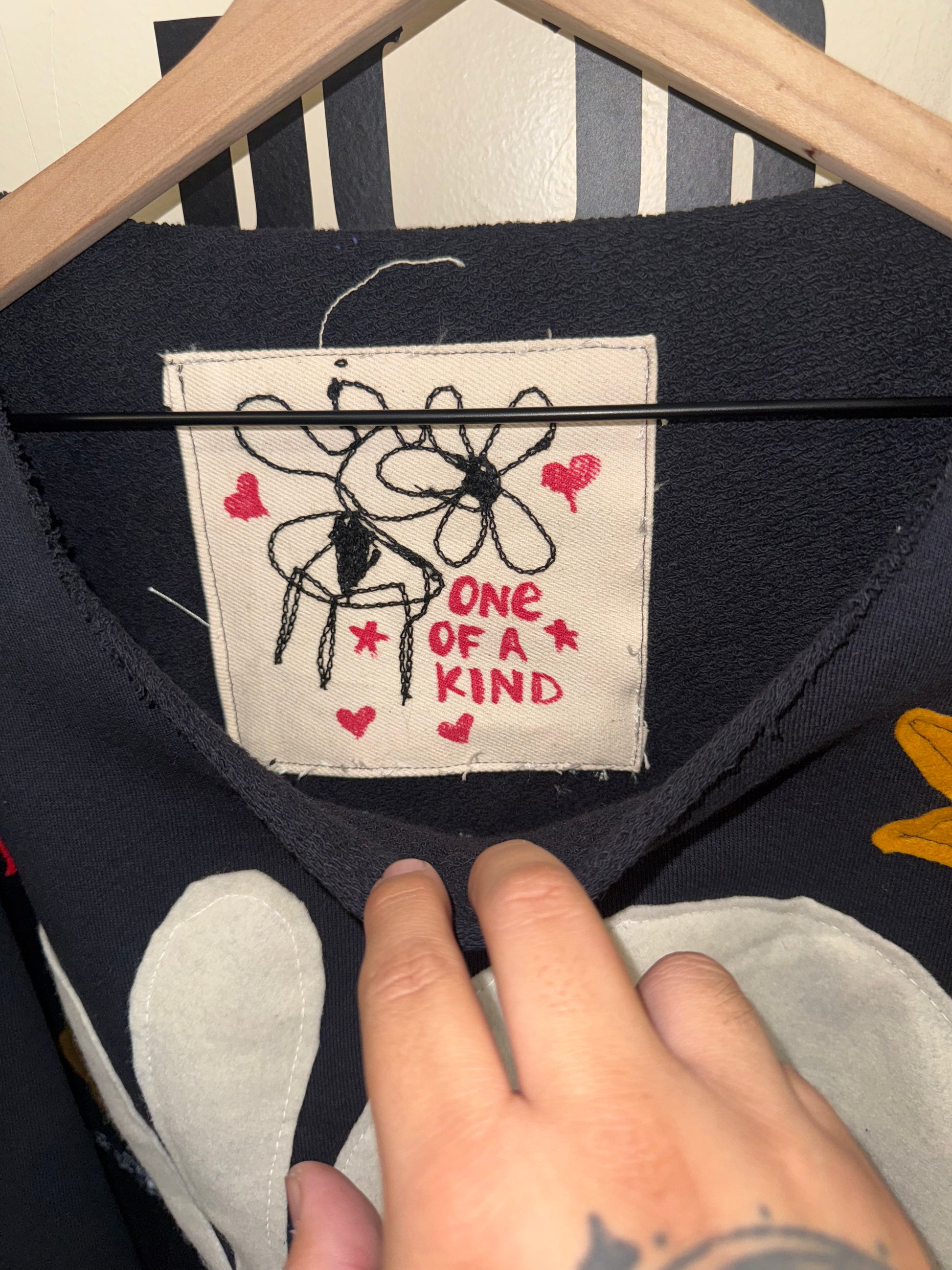 WARNING! THIS PIECE IS MADE FROM A REMNANT PIECE OF FABRIC, AT MY FRIENDS FACTORY WHEN THE BOLT IS TOO SHORT THEY FLAT LOCK STITCH THE SHORT PIECE ONTO THE END OF THE ROLL. RATHER THAN THROWING AWAY THE SCRAP I UPCYCLED IT INTO A CREWNECK. I PERSONALLY LIKE THE CHAOTIC AND IDIOSYNCRATIC NATURE OF IT BUT SOME PEOPLE MIGHT CONSIDER IT TRASHED.